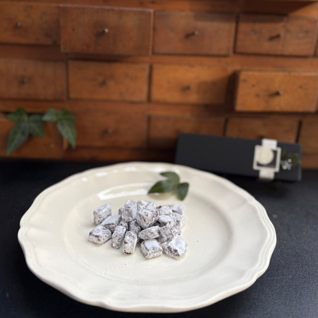 材料はチョコレート、クリーム、バターに、フランスのリンゴの蒸留酒カルヴァドスを加え、仕上げに粉糖をまぶしました。